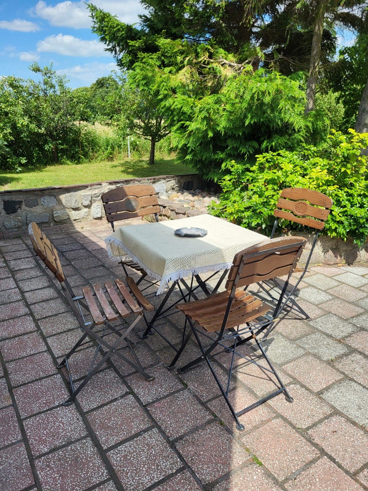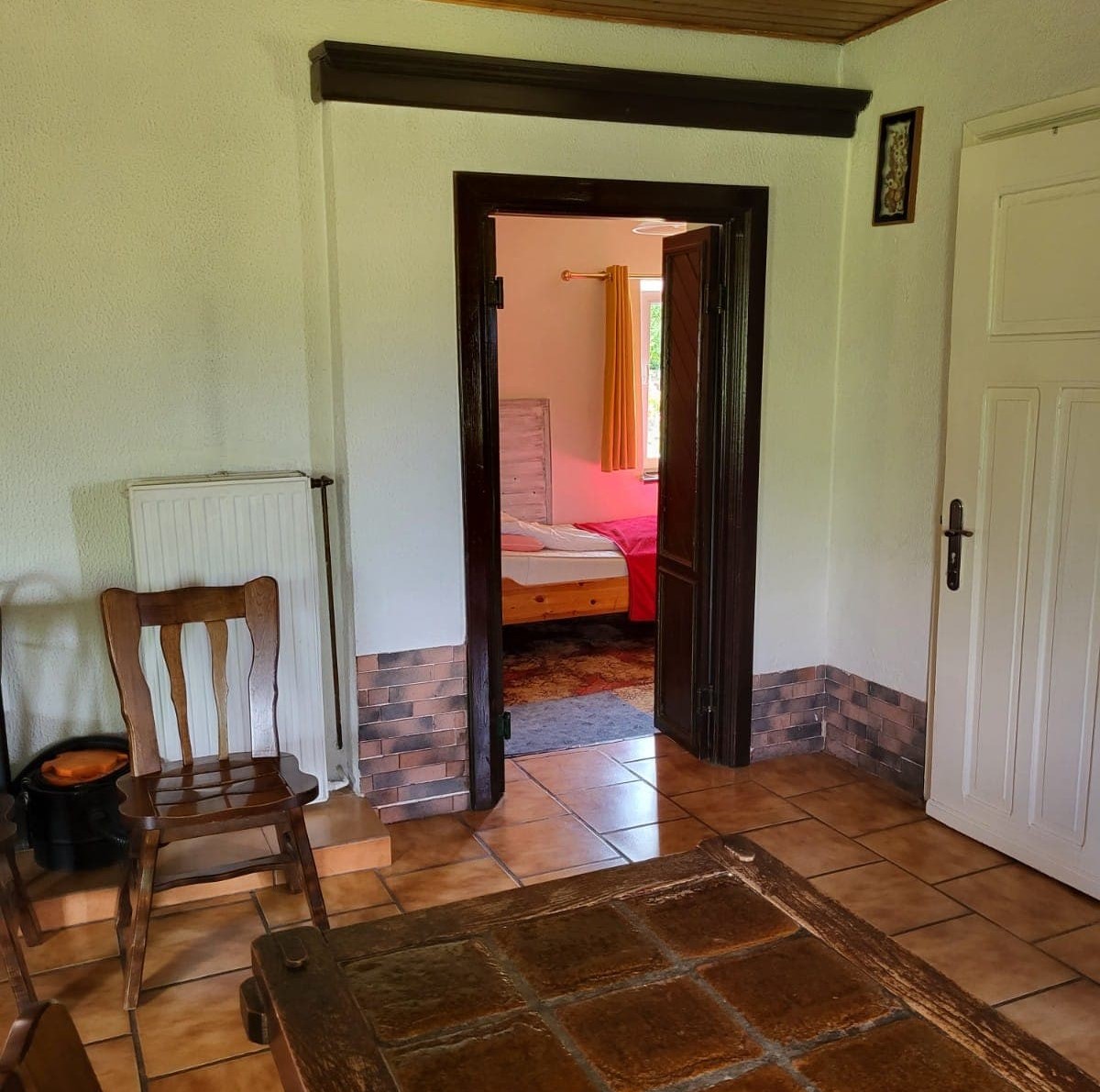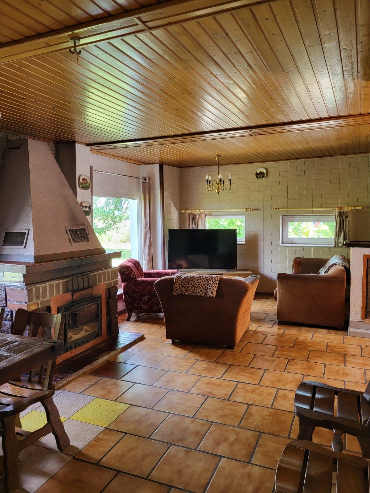 W domu znajduje się przestronny salon z aneksem kuchennym, trzy sypialnie, dwie toalety oraz jedna łazienka z wanną. Do użytku jest również duży ogród z placem zabaw i miejscem na ognisko.